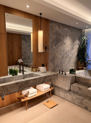 Throughout the establishment, you'll find furnishings thoughtfully crafted from reclaimed wood. Examples include a captivating check-in desk hewn from a captivating, textured piece of Sussex wood and coffee tables styled to resemble tree trunks. Notably, Studio Patrick Nadeau has contributed a stunning "living" chandelier named "Rainforest." This ethereal masterpiece is constructed from Spanish moss, with over 50,000 strands gracefully draping from the ceiling in a captivating dome-like structure, casting an enchanting light as night descends. In the lobby, I found the large stones affixed with handles, mimicking luggage, to be a subtle yet whimsical detail that added to the overall charm.